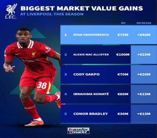红军球员身价涨跌赫拉芬+4000万欧涨最多努涅斯2500万欧跌最多