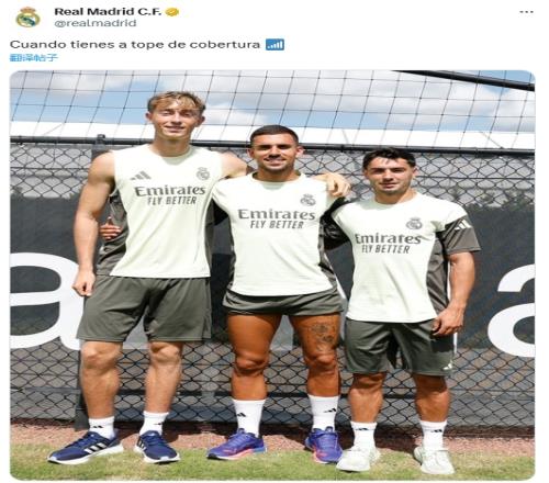 皇马官推晒怀森、塞巴略斯、迪亚斯合影,配文:当你拥有满格信号时